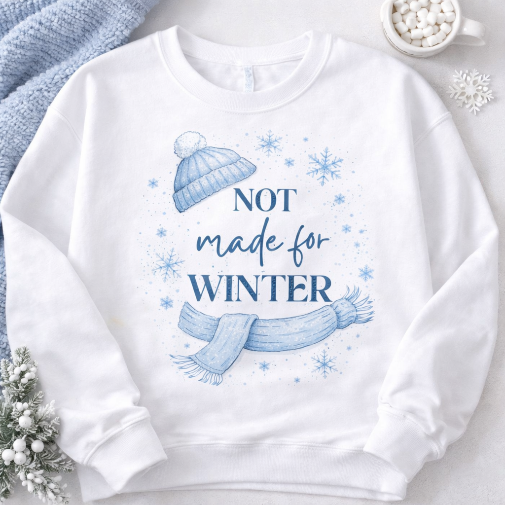 Express your winter mood with this playful not made for winter design featuring snowflakes and cozy cold weather elements.