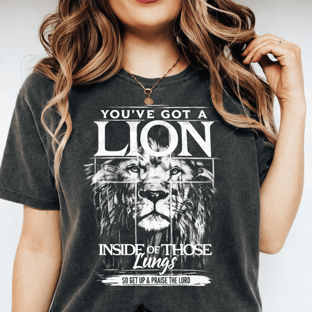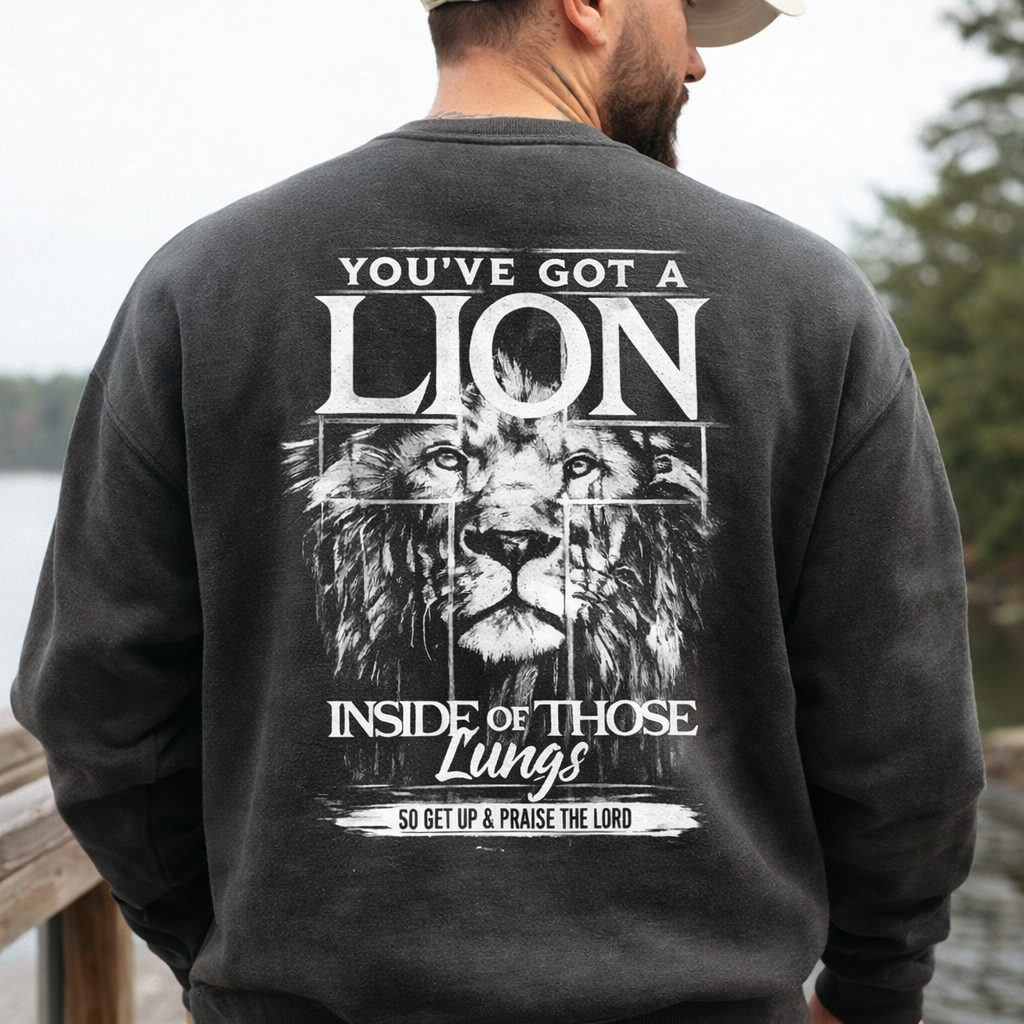 Bold your faith with strength and confidence in our “You’ve Got a Lion Inside Those Lungs” Christian sweatshirt. Featuring a powerful lion graphic and uplifting message, this design is a reminder to rise up, praise the Lord, and walk in faith with courage.